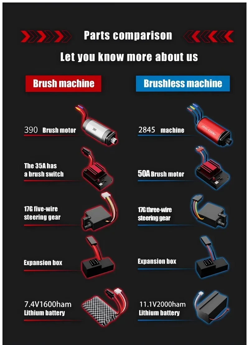 The Standard Version (Brushed): Ideal for younger drivers or those new to the hobby. Equipped with a reliable Brushed Motor and a 7.4V battery, it hits a respectable 50km/h, offering fast-paced action that is easier to control.