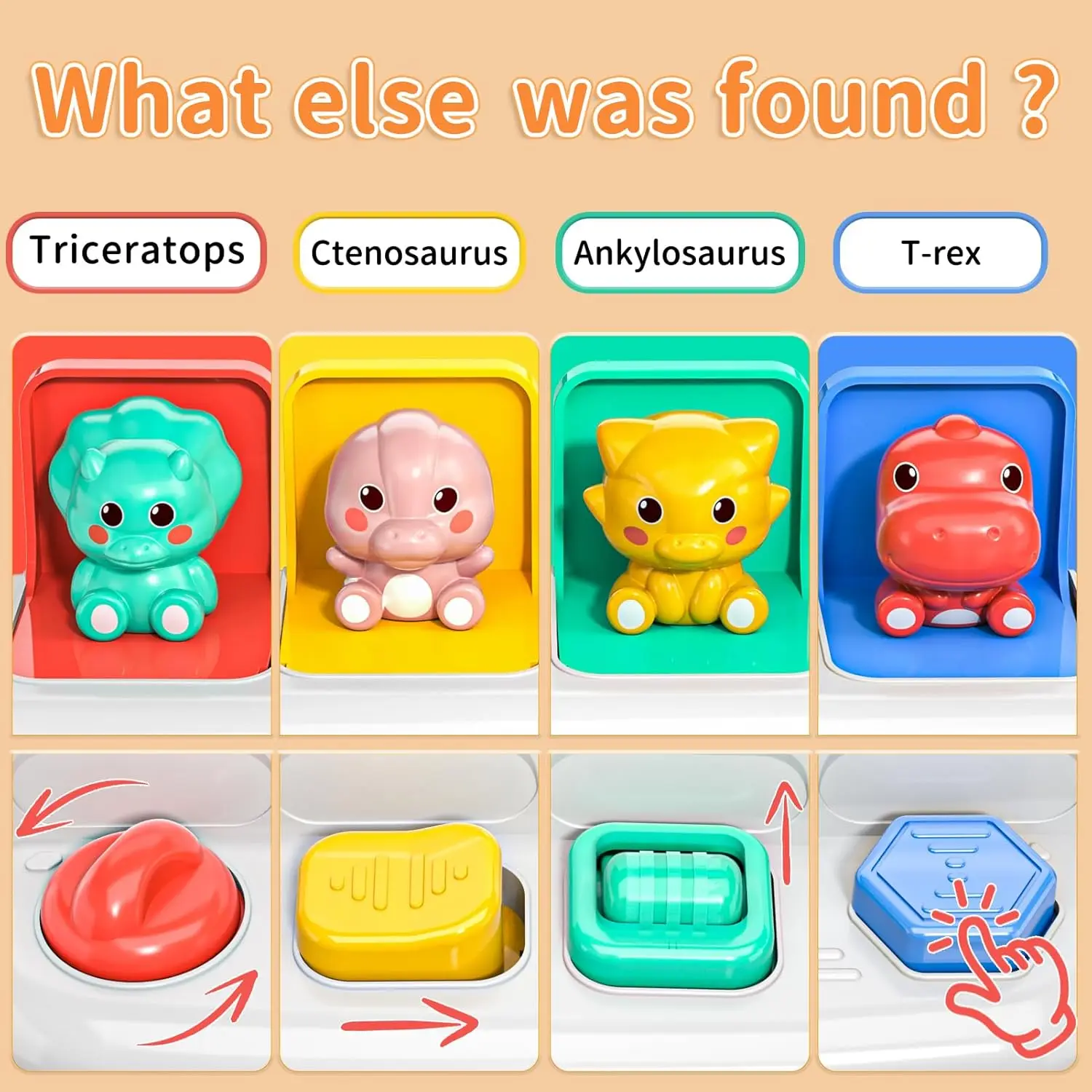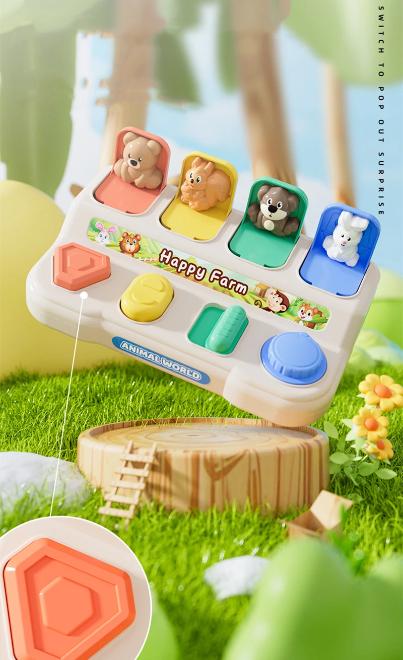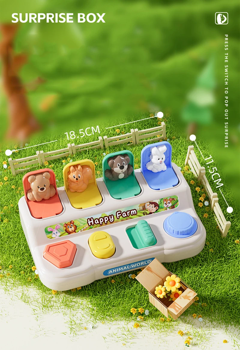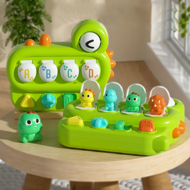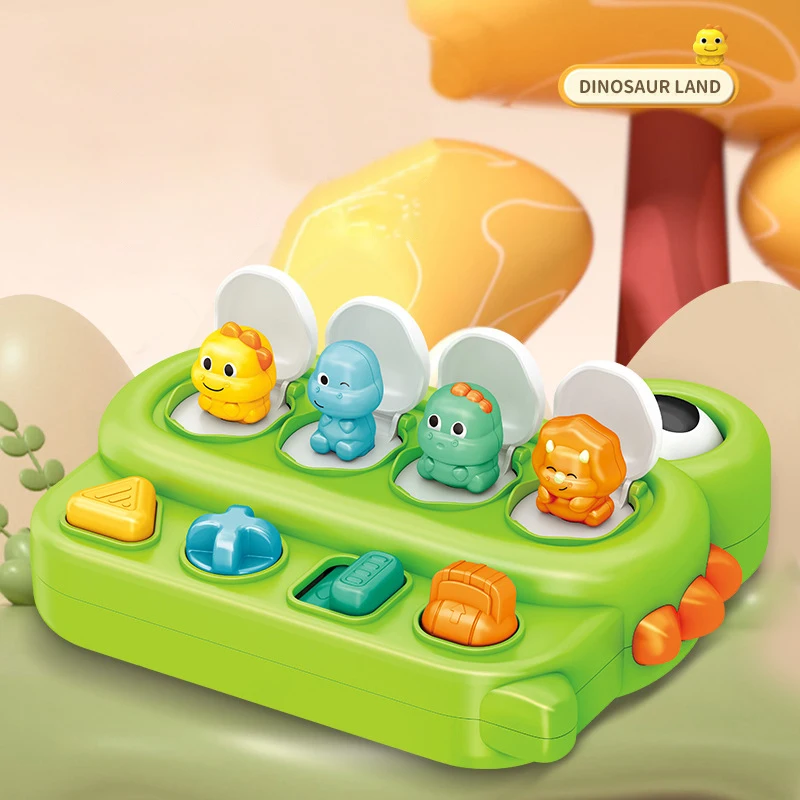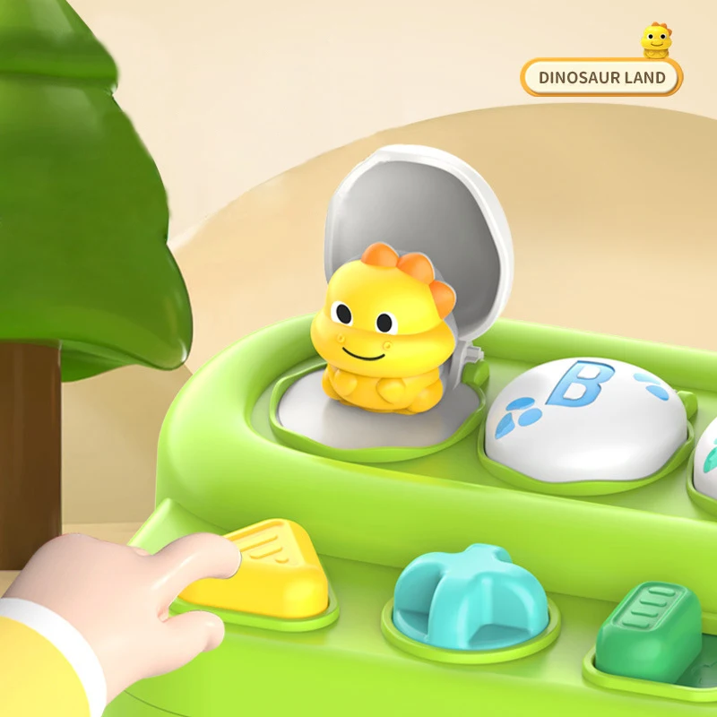 Interactive Pop-Up Action Features four hidden dinosaurs that pop up when the corresponding buttons are pressed, twisted, or flipped, teaching babies the fundamental concept of cause and effect.