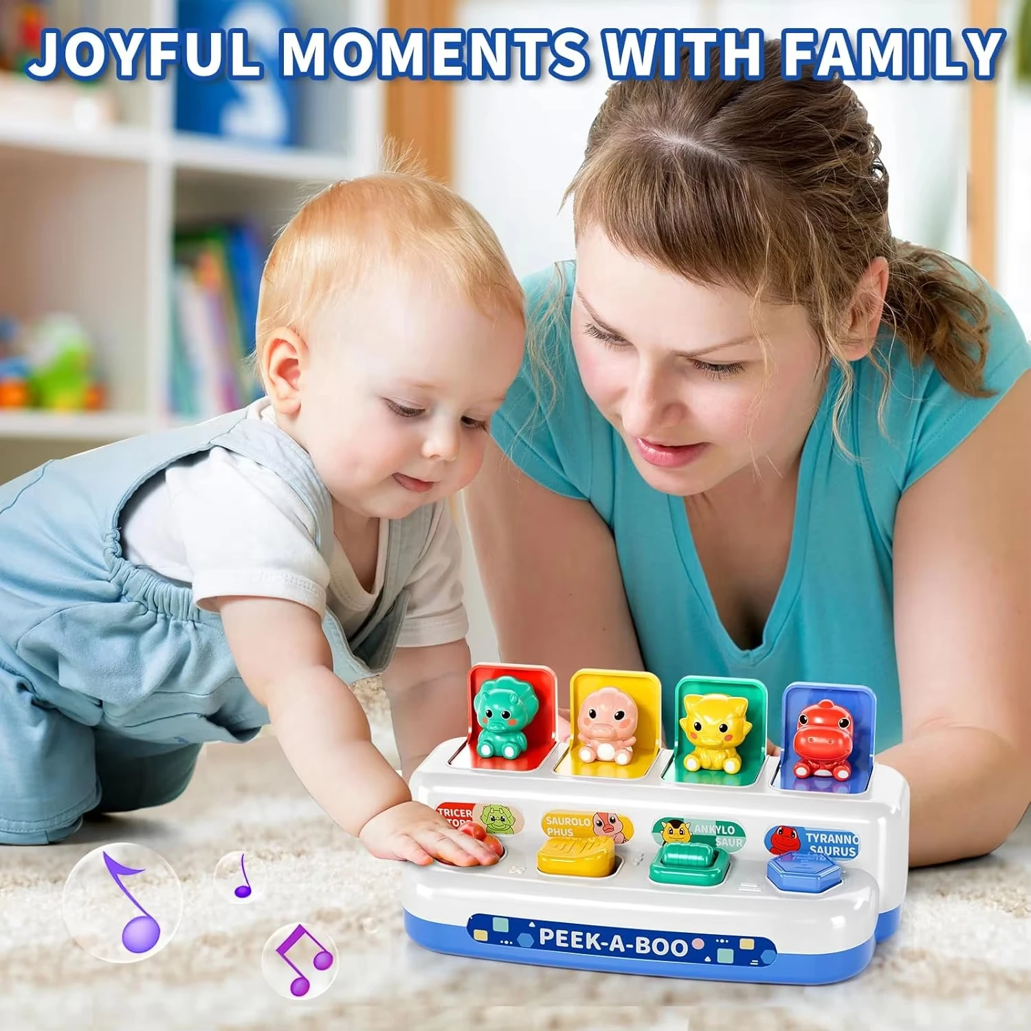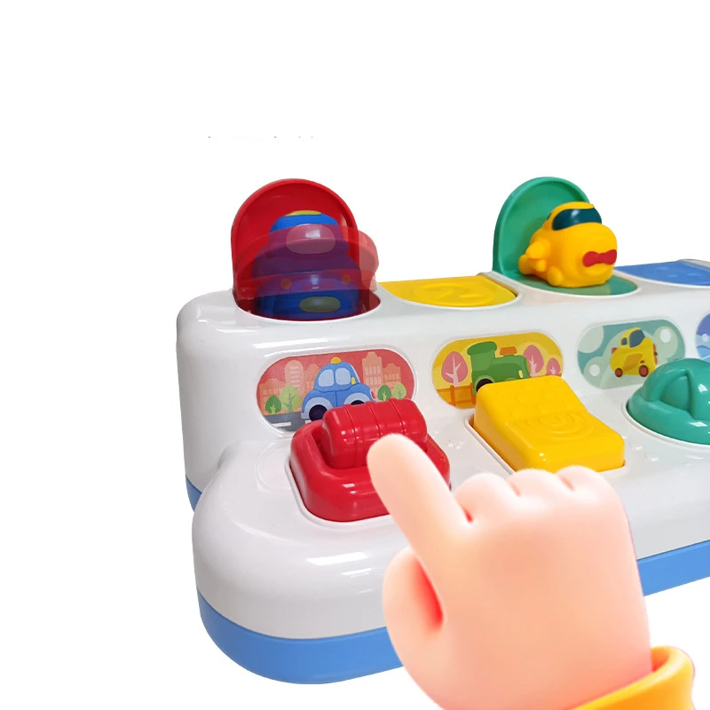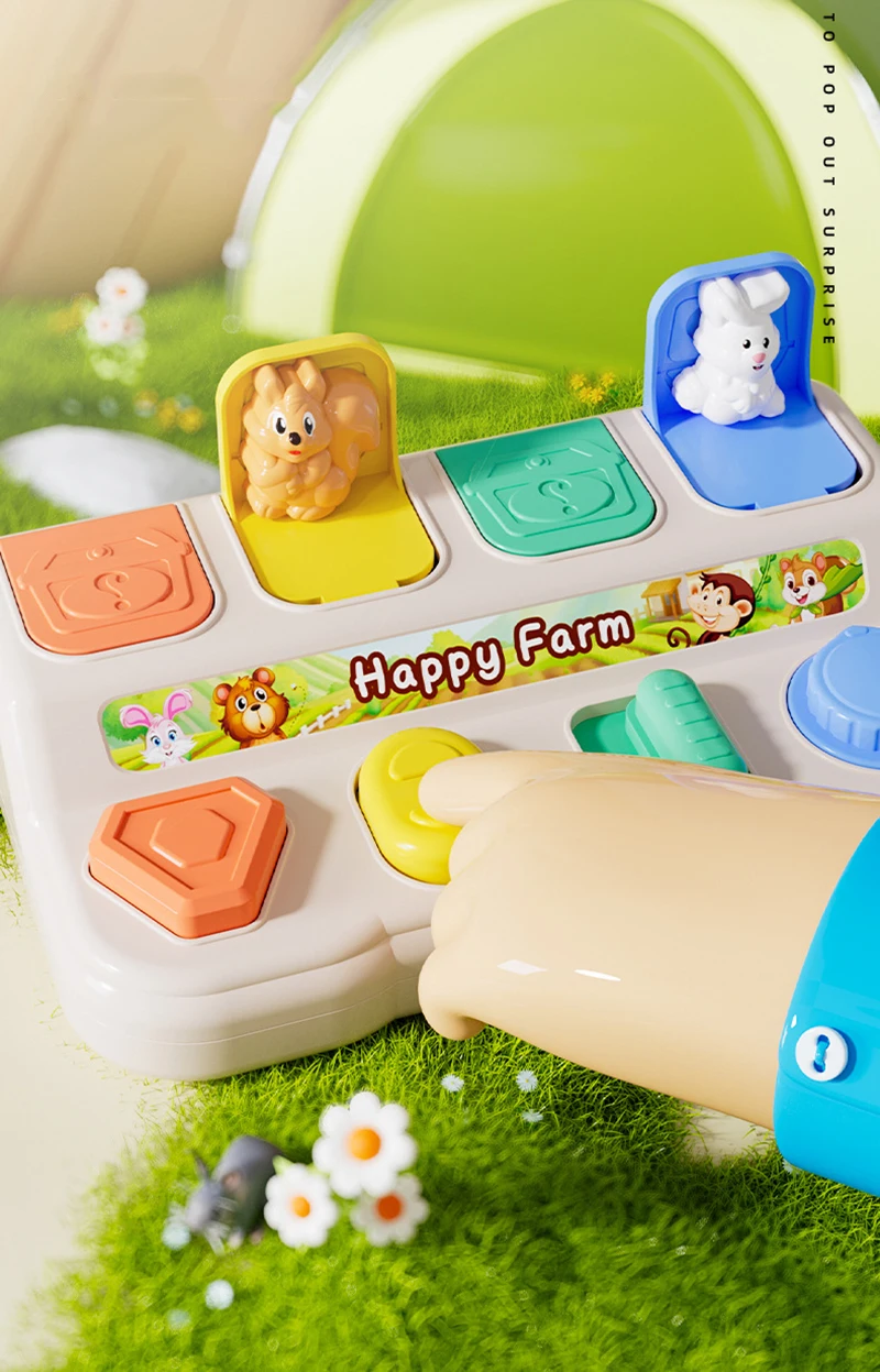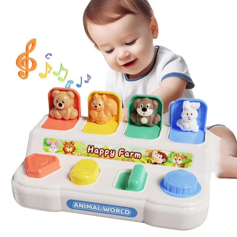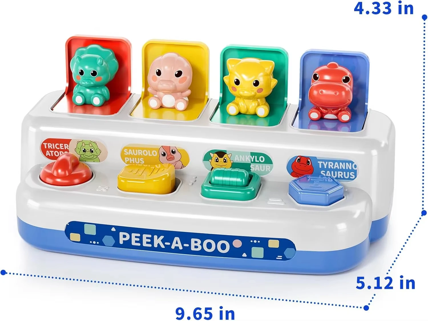 Interactive Pop-Up Action Features four hidden dinosaurs that pop up when the corresponding buttons are pressed, twisted, or flipped, teaching babies the fundamental concept of cause and effect.