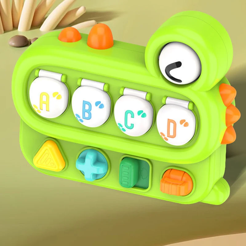 The toy features four distinct buttons—a toggle, a switch, a dial, and a push-button—each requiring a different hand action to operate. When activated, a friendly dinosaur pops up from its hiding spot! This variety of movements helps toddlers develop essential fine motor skills, finger dexterity, and hand-eye coordination.