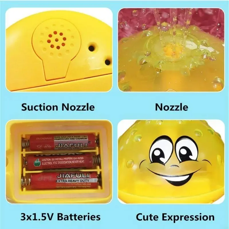 Colourful LED Lights Equipped with vibrant LED lights that flash as the toy operates. The combination of spinning lights and spraying water creates a magical atmosphere in the tub.