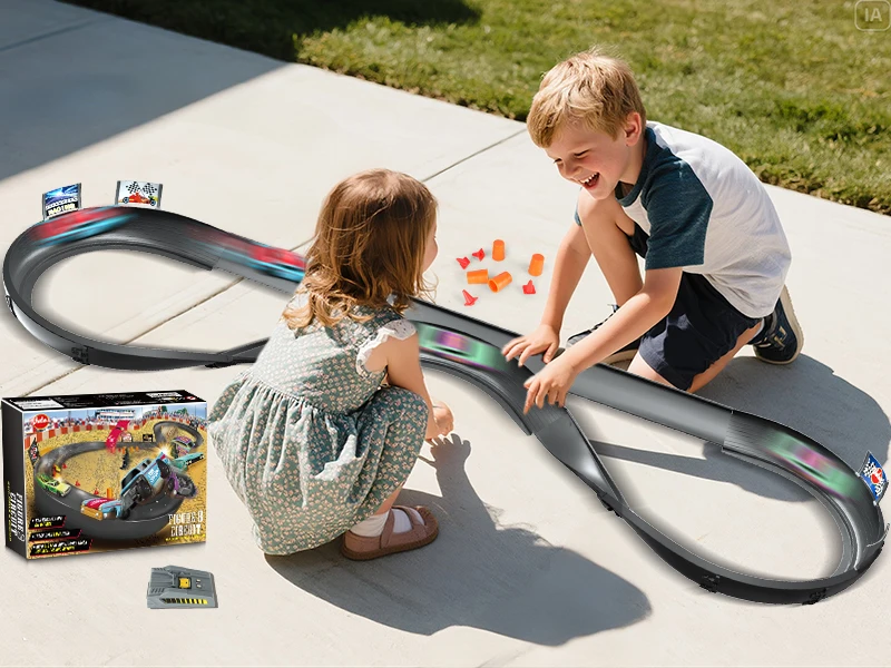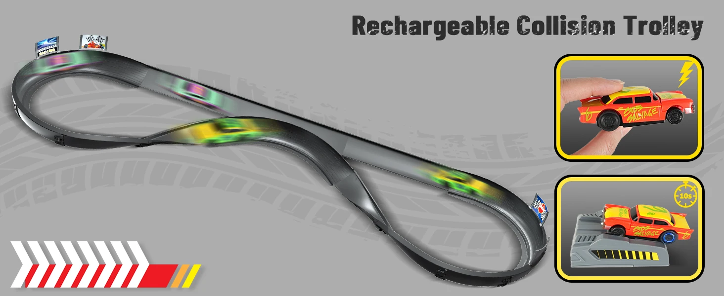 The modular track design allows two exciting layouts — a figure-8 collision track for dramatic crashes or a B-shaped racing circuit for pure speed control. At the crossing point, no race is predictable, creating heart-pounding moments that kids love.